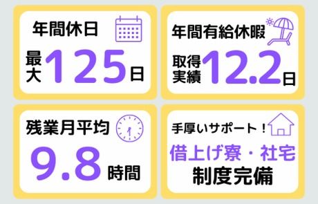 休日休暇 | 休日 年間休日最大125日 完全週休2日制(土・日)/祝日/GW、夏季、年末年始 ※上記は、配属先のカレンダーに準ずる 有給休暇(年間有給取得実績12.2日) 産前・産後休暇 育児休業 介護休業 特別休暇 慶弔休暇 |