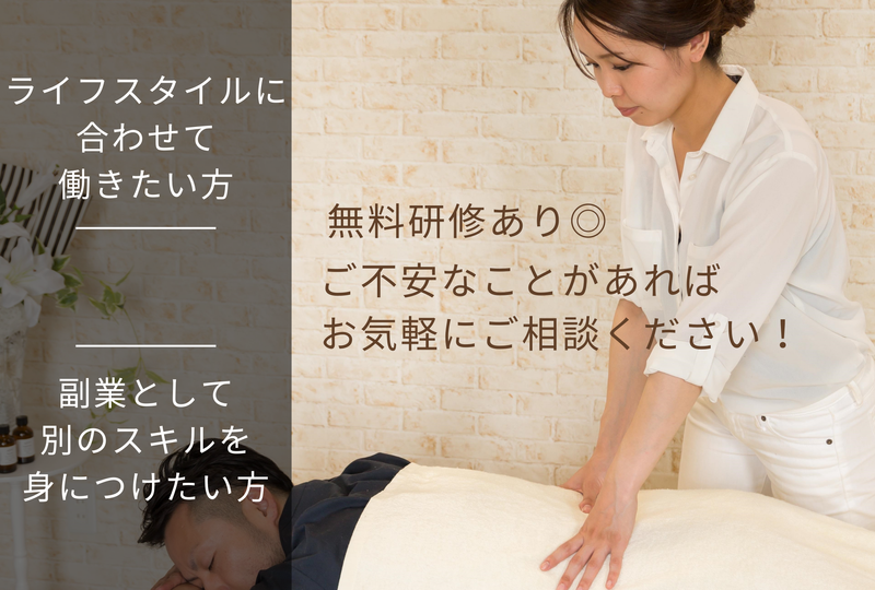 職種/仕事内容 | 仕事内容 ⭐100%希望シフト!完全歩合制!⭐ ⭐無料研修で一生モノの技術が身に付く⭐ ⭐スタッフの8割が未経験スタートです⭐ 「自分の都合で働きたい」「手に職をつけたい」 そんなあなたにピッタリの職場です! 【お仕事内容】 全身もみほぐし・ヘッド・足つぼ・ハンド・リンパマッサージなど施術でお客様のコリや緊張を緩めていきます。 マニュアルもあるから、初めての方・ブランクがある方でも安心です◎ 無料の研修があるから未経験でも安心!一通り覚えれば、一生モノの技術が身に付きますよ! 当店では、あなたのライフスタイルを尊重した働き方を応援します。 子育て中の方、Wワーク希望の方も大歓迎! 無理なく、自分らしく輝ける環境をご用意しています。 \当店で働く嬉しいメリット/ ✅完全自由シフト制 柔軟なシフト自己決定でプライベートも充実! あなたの都合に合わせてシフトを組むことが可能です。 お子様の塾の送り迎えなど、プライベートな時間に合わせて勤務できるため、ご家庭との両立も無理なく行えます。 シフトは前月の15日までに提出、25日には確定するので、プライベートな予定も立てやすいのが特徴です。 ✅無料研修制度あり 未経験の方も安心スタート!基礎から丁寧に指導いたします。 ✅経験者優遇 これまでの経験をしっかり評価!あなたのスキルを活かして、のびのびと活躍できます。 ✅多彩な施術でやりがいUP 様々な種類の施術を通して、お客様の美をサポートする喜びを感じられます。 \スタッフの声:私が当店を選んだ理由/ 「子育て中でも働きやすい!」 勤務時間を自分で決められるので、子供の急な用事にも対応でき、安心して働けています。(30代・女性) 「手に職をつけたい!」 未経験からでも無料で研修を受けられるので、スキルアップを目指したい私にピッタリでした。(20代・女性) 「年齢や体力に自信がなくても大丈夫!」 少ない日数から始められるので、無理なく働くことができます。経験も考慮してもらえるので、安心してスタートできました。(40代・女性) 「お客様をキレイにするのが楽しい!」 色々な施術でお客様に喜んでいただけるのが、何よりのやりがいです。(20代・女性) 気になることは気軽にお問い合わせください! 「自分でも出来る?」「ホントに稼げるの?」などなど、疑問点は何でも聞いて下さいね! |
