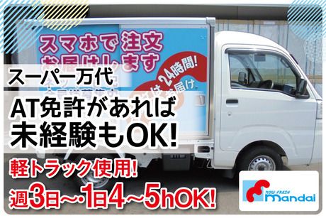 職種/仕事内容 | 仕事内容 【 アピールポイント 】 <万代の新規サービス★宅配ドライバー> ・扶養控除内や短時間勤務、Wワークも相談可 (夕方まで&1日4~5h勤務) ・家庭と両立しながら働く主婦(主夫)の方多数在籍中 ・力仕事も少なめ・台車を使用するので、ミドル、シニアの方も活躍中! ・希望休も最大限考慮!ご家族の予定やお子様の学校行事等もご相談ください♪ 【 仕事内容 】 宅配用軽トラックを使用し、店舗からお届けエリア内に、 ネットで注文された商品をお客様宅へお届け! (宅配ロッカー、置き配、直接お渡し) その他、下記業務をお願いします。 ・トラックへの荷積み ・ネット宅配会員募集(店頭ブースでの対応、自宅訪問等) ・新規会員様のお客様宅へ出向き、登録に伴う説明業務 ・宅配ロッカーの設置 ・備品管理 ・日報作成 など 商品は台車使用して運ぶため、力仕事に自信がない方も安心◎ 宅配だけでなく、会員登録に伴う説明などお客様との対話もあり、 メリハリをつけて働けます◎ <1日の流れ(例)をご紹介!> ▼出勤 注文内容を確認し配送スタート! *配送エリアはお届エリア内 ▼お昼休憩 ▼お仕事再開 配送、会員募集活動、本登録訪問(説明・ロッカー設置) 備品清掃 ▼お仕事終了! *お仕事復帰さんやブランク明けでもOK! 【 未経験でも安心!AT・普通免許でOK 】 ▼ドライバー経験は必要なし▼ 配達は軽トラックを運転していただきます。 小回りも利くため、宅配未経験の方でもデビューしやすいです。 もちろんAT限定の普通免許の方でも運転OK 日常で運転をしている方なら問題なく慣れていただけます! 研修では助手席に先輩が乗って運転しますので、ご安心ください◎ 【 主婦(夫)さんやミドルスタッフ多数在籍! 】 運転が好き、人と話すのが好き、スキマ時間で働きたい 生活に合わせて柔軟に働きたい…そんな方におすすめ! ・1日4h~OK ・お子様の急な発熱も全員でサポート◎ ・Wワークもご相談ください! …など、働きやすさが詰まった職場! その為か、他店舗では主婦さんやフリーターさん、 ミドル・シニアの方々と、幅広く皆様活躍しています。 また、スタッフ同士で助け合う風土。 安心して働けると人気なんです♪ |