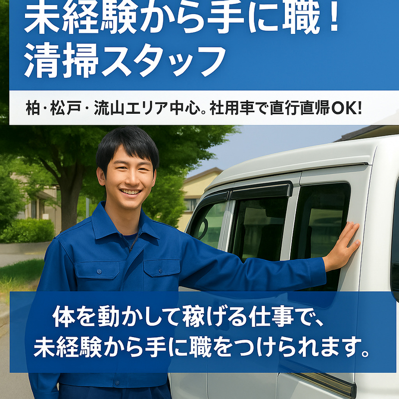対象となる方 | 求めている人材 未経験歓迎・学歴不問! 必要なのは普通自動車免許(AT可)のみ。 こんな方を歓迎します: コツコツと作業するのが得意な方 体を動かす仕事が好きな方 チームで協力しながら仕事を進めたい方 安定した収入を得たい方 地元で腰を据えて働きたい方 前職が配送・製造・建設・整備など、異業種出身の社員が多数活躍中! 入社後は先輩が同行し、現場の流れや清掃のコツを丁寧にサポートします。 「手に職をつけたい」「努力がきちんと評価される職場で働きたい」 そんな方に最適な環境です! |