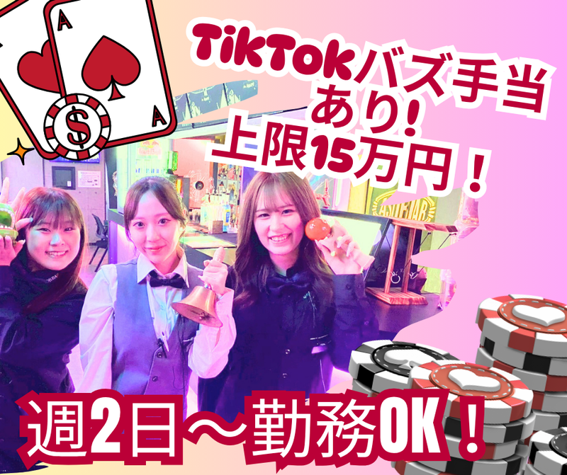 待遇・福利厚生 | 【保険制度】 雇用保険、労災保険、健康保険、厚生年金 【福利厚生】 待遇・福利厚生 【福利厚生】 交通費規定支給 制服貸与 髪色・ピアス・ネイル・ひげ自由 昇給制度有 リーダー手当(5,000円~1万円)支給 ボーナス制度有 報奨金制度有 まかないあり (※1食100円で食べることができる自慢のまかないは、出勤前や勤務中など自由度高めで取っていただけます。また、レパートリーも盛りだくさん!オムライスやパスタなどがまかないに♪) 正社員登用制度(社会人としての基礎から研修でしっかりとお教えします。正社員への実績有) 扶養控除内での勤務OK 掛け持ち・副業・WワークOK TikTokバズ手当て(月上限10万円) 【激アツ手当を新設しました!】 金曜・土曜出勤で最大5,000円支給 繁忙期手当最大1万5,000円支給 |