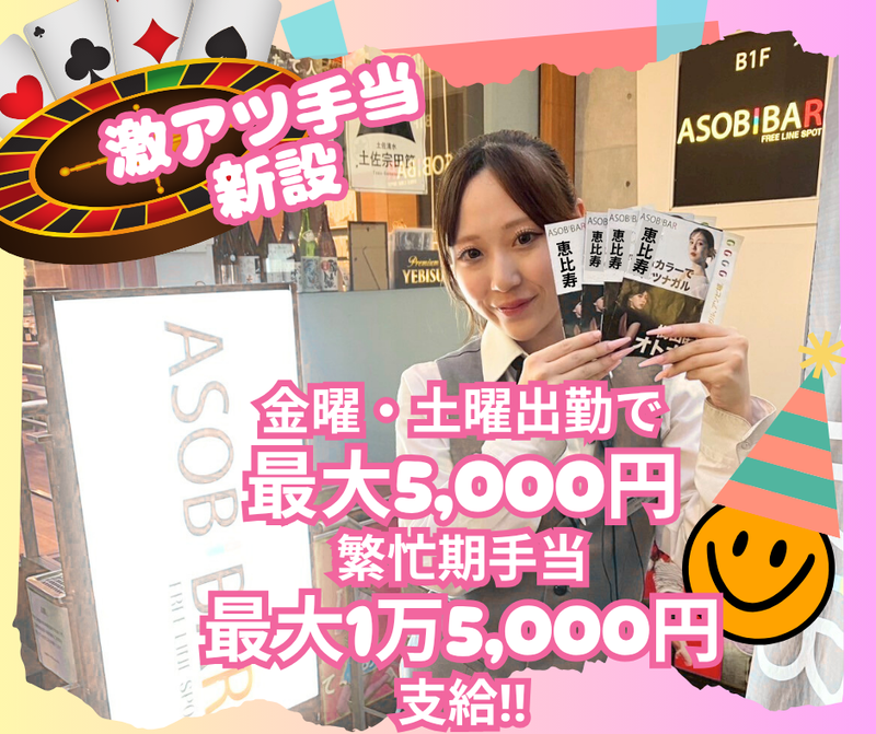 勤務地 | ASOBIBAR(アソビバー) 恵比寿西口駅前店 150-0022東京都渋谷区恵比寿南1-14-15 ラ・レンヌ恵比寿B1F |
