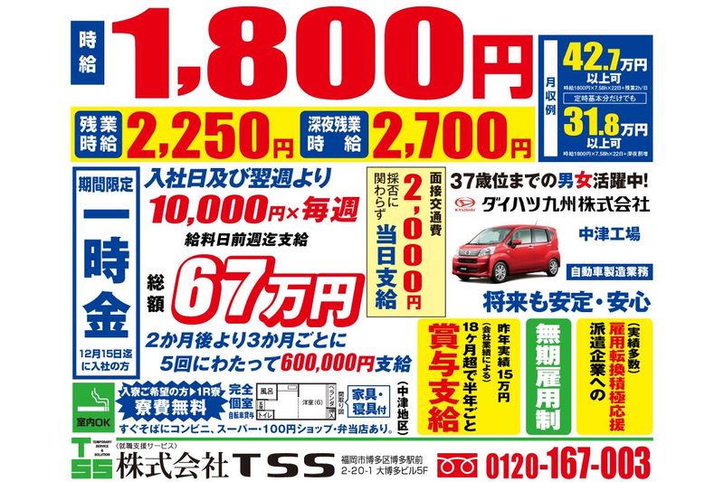 職種/仕事内容 | 仕事内容 <超一流大手企業での製造業務!年休121日> 月収42万以上も可能 未経験からスキルを習得可! 安定して長期間安心 面接交通費の2000円は現金支給 一時金で満足 製造スタッフ ~自動車の生産ライン業務~ ・組立て ・塗装 ・検査 など 37歳位までの男女活躍中! <期間限定一時金> (1)毎週1万円を 初回給料日前週まで 最長6回支給(皆勤時) (2)1回目 10万円 2回目 11万円 3回目 11万円 4回目 11万円 5回目 17万円 (各対象期間中、準皆勤要) >>準皆勤時5回にわたり、 3ヶ月毎に総額60万円支給 |