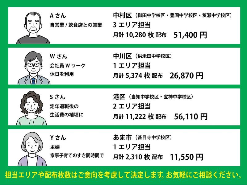 給与 | 完全歩合制 給与詳細 完全歩合制 5円~/1ポスト 集合住宅配布、配布エリア専任制のため、短時間で効率よく配布可能です♪ 【給与例】 給与例 ●Aさん ※自営業/飲食店との兼業 【 中村区 / 御田中学校区・豊国中学校区・笈瀬中学校区 】3エリア担当 一か月で計10,280枚配布 51,400円 ●Kさん ※定年退職後の生活費の補填に 【 港区 / 当知中学校区・宝神中学校区】2エリア担当 一か月で 計11,222枚配布 56,110円 ●Wさん ※会社員Wワーク・休日を利用 【中川区 / 供米田中学校区】1エリア担当 一か月で 計5,374枚配布 26,870円 ※配布エリアや配布枚数などはご意向を考慮して相談して決定します。 ※お気軽にご相談ください。 |