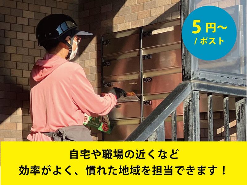 職種/仕事内容 | 仕事内容 指定の物件(賃貸タイプ集合住宅)に当店舗のチラシを投函するだけ! 地図アプリで配布物件を確認します。 スマホ操作に抵抗感がなければシンプルな仕事なので、 幅広い年代・立場の方が活躍できるお仕事です♪ 店舗への出勤は必要なし。 2週に一度チラシの受け取りで来ていただくだけなので、 自宅や勤務先近くで、すき間時間に働きたい方にオススメです! ≫≫≫ お仕事の流れ ≪≪≪ ●配布チラシをまとめて引き取り後、働けるときにご自宅から勤務。 ●配布期間は約2週間。期間内に受け持っていただく配布量を配り切っていただければ大丈夫! ※配布エリアは今後も専任でお任せします。 2週間ごとに同じエリアを配布するので、2回目以降は慣れて、 効率よく配布・高時給も目指せます! |
