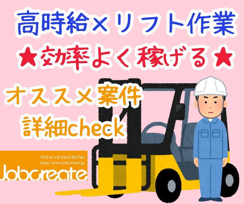 職種/仕事内容 | 仕事内容 No.49331 \高時給×安定収入!/ リーチリフトでの入出庫・ピッキング作業スタッフ募集★ 【お仕事内容】 リーチリフトを使った シンプル倉庫作業 です。 オーダーシートを見ながら、下記の流れで作業していただきます。 入庫作業:トラックで届いた商品を決められた場所にサッと格納 出庫作業:指示書通りに商品をピッキング→出荷準備 倉庫でのリフト経験が少しでもあればすぐ慣れます! ブランクがある方も先輩が丁寧にサポートするので安心♪ 【月収例】 時給1,600円×8h×21日=268,800円 +残業代 +交通費全額支給 ◇アピールポイント◇ ・高時給1,600円スタートで安定収入◎ ・リフト経験が浅くても安心のサポート体制! ・リフト業務にブランクある方でも大歓迎! ・安定した仕事量で長期安定勤務が可能! ・残業ありでさらに収入UP!ガッツリ稼ぎたい方に◎ ◇職場環境◇ ロッカー・空調完備の休憩室あり! 制服無償貸与 バイク通勤OK! 20代・30代・40代の方が活躍中の職場です! ◇休日◇ シフト制 週休2日 ◇時間◇ ①8:00~17:00 ②9:00~18:00 実働:8時間 休憩:60分 ①②どれかをお選びください♪ ◇資格・経験◇ フォークリフト免許 ◇交通費◇ 実費全額支給(規定あり) *徒歩・自転車・バイクは通勤距離による✨ *公共交通機関の場合は交通費全額実費支給 ◇アクセス◇ JR「北伊丹駅」徒歩4分 尼崎市からで約20分で通勤可能♪ 宝塚市からも約25分で通勤可能 *バイク・自転車OK! 【当社概要】 ジョブクリエイトは 大阪府高槻市にある派遣会社です。 製造、倉庫内、梱包などの軽作業はもちろん オフィスワークや販売促進など 豊富な人材サポートを行っております! 阪急高槻市駅から歩いて3分♪ 来社不要のWEB面談も実施しております! ご希望の方はお気軽にお申し付けください☆ ※土日祝日に頂いたご応募に関しましては、 翌営業日に順次対応させていただきます。 |