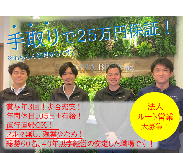 職種/仕事内容 | 仕事内容 ◆入社8年目で年収800万円の社員も! ◆賞与年3回(合計60~130万円程度) ◆残業ほぼなし/18時台に退社も多数 ◆新規開拓・テレアポ・飛び込みなし ◆社用車貸与/直行直帰OK ◆手取り25万円保証からスタート ◆担当数が増えるほど歩合給UP! 代表やほかの営業が長年担当していた お客様を引き継ぐ形のため、 無理な提案や売り込みはもちろん 新規の飛び込み・テレアポは一切なし。 お客様は埼玉を中心とした1都3県。 1日1〜4件の訪問で 現場の確認や打ち合わせがメイン。 残業もほとんどなく、 直行直帰OKなので 自分の時間も大切にできます。 ※即戦力急募!経験を活かせる環境!経験に応じて給与も決定します! ※住宅業界やリフォーム営業の経験がある方は特に歓迎! ―――――【仕事内容】――――― 法人顧客(工務店や管理会社、 クリニックなど)に対して、 ハウスクリーニングや 内装リフォーム工事をご提案。 関係構築を大切にできる営業スタイルです。 ▼具体的には ・現場の確認 ・顧客との打ち合わせ ・見積もり作成 ・工事スケジュール調整や段取り管理 経験に応じて研修期間を設定し、 業務の流れを学びながら、 少しずつ顧客を引き継いでいきます。 業界未経験の方は知識面も しっかりとフォローしていきます。 ――【埼玉美工はどんな会社?】―― 当社はハウスクリーニングを軸に 内装工事全般を手がける安定企業。 35年間、黒字経営を継続し、 埼玉・東京エリアを中心に60名以上の プロフェッショナルが活躍しています。 確かな基盤のもと、多様な工事を請け負い、 お客様の快適な空間づくりを支えています! |